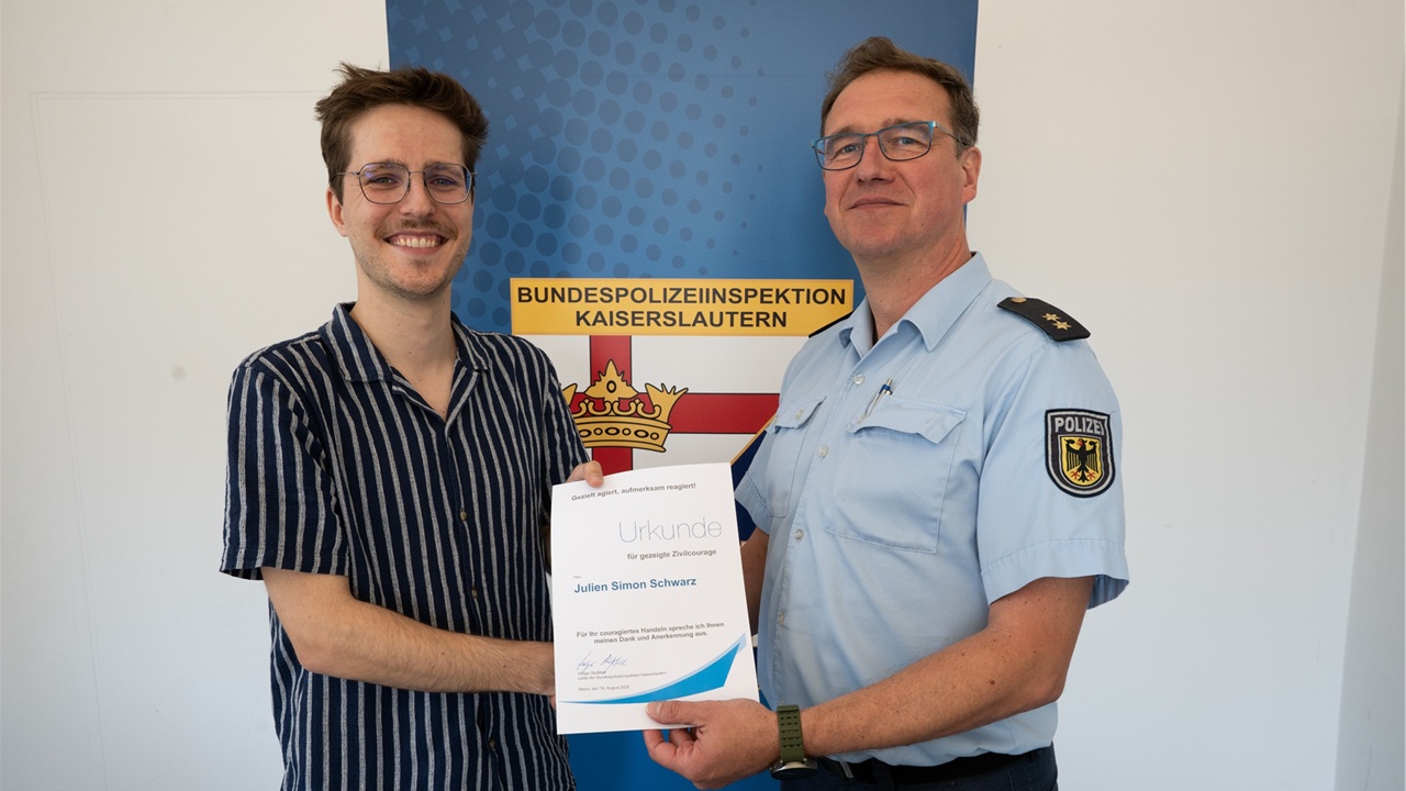 Der Leiter der Bundespolizeiinspektion Kaiserslautern, Holger Bloßfeld, nahm dies zum Anlass, Herrn Schwarz einzuladen und dessen Mut sowie Unerschrockenheit zu würdigen. Polizeioberrat Bloßfeld stellte klar heraus, dass ohne das couragierte Eingreifen von Julien Schwarz der 35-Jährige heute nicht mehr am Leben wäre.