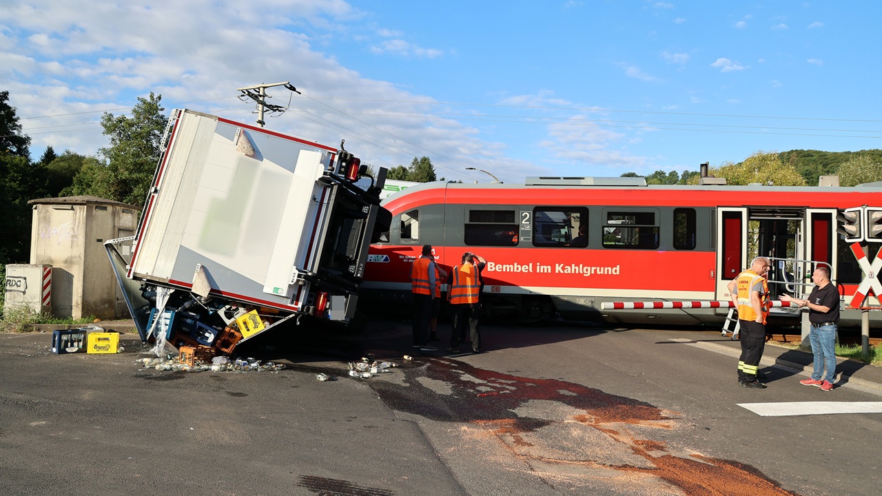 Der mit Getränken beladene Lastwagen stand den ersten Angaben zufolge aus zunächst unbekannten Gründen auf dem Gleis, als die Schranken heruntergingen. Der Regionalzug der Kahlgrundbahn auf dem Weg von Alzenau nach Mömbris konnte nicht mehr rechtzeitig bremsen. Der Anhänger des Lasters kippte durch den Zusammenstoß um. Die Strecke der auch Bembelbahn genannten Linie von Kahl nach Schöllkrippen wurde nach Angaben der Polizei zunächst komplett gesperrt.