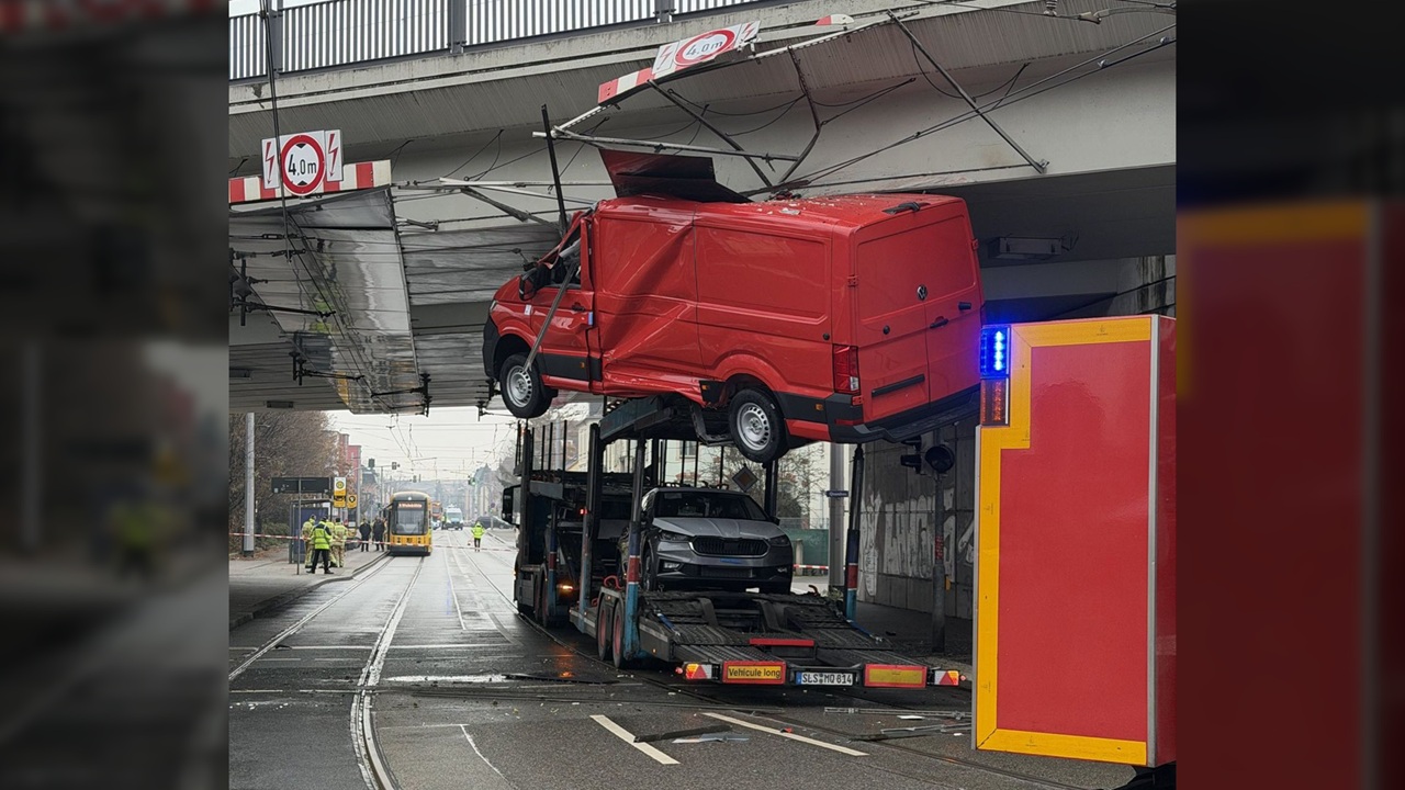 Ein Lkw-Autotransporter ist in Dresden unter einer Brücke hängen geblieben. Infolge des Unfalls war auch der Straßenbahnverkehr beeinträchtigt.