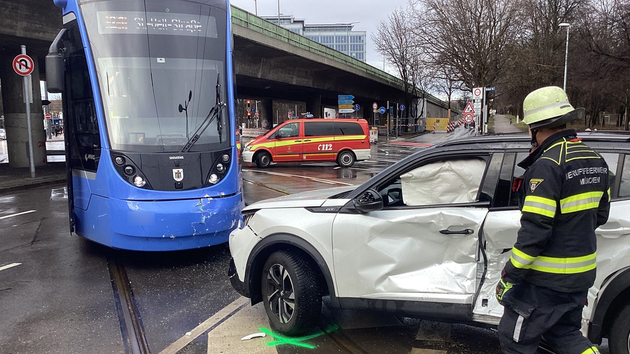 Im Kreuzungsbereich Dachauer Straße/Landshuter Allee in München ist es am Sonntagmittag zu einem Zusammenstoß zwischen einer Straßenbahn und einem Pkw gekommen. Wie die Feuerwehr mitteilte, war eine Tram der Linie 21 in Richtung St.-Veit-Straße unterwegs, als es zur Kollision kam. Das Auto wurde auf der Fahrerseite stark beschädigt, die Airbags lösten aus, auch die Tram wies Schäden im Frontbereich auf. Zwei Personen wurden leicht verletzt und vor Ort in einem Rettungswagen versorgt. Ein Transport ins Krankenhaus war nicht erforderlich. Die Feuerwehr sicherte die Unfallstelle und unterstützte nach der polizeilichen Aufnahme beim Räumen der Fahrbahn. Die Polizei ermittelt zum Unfallhergang.