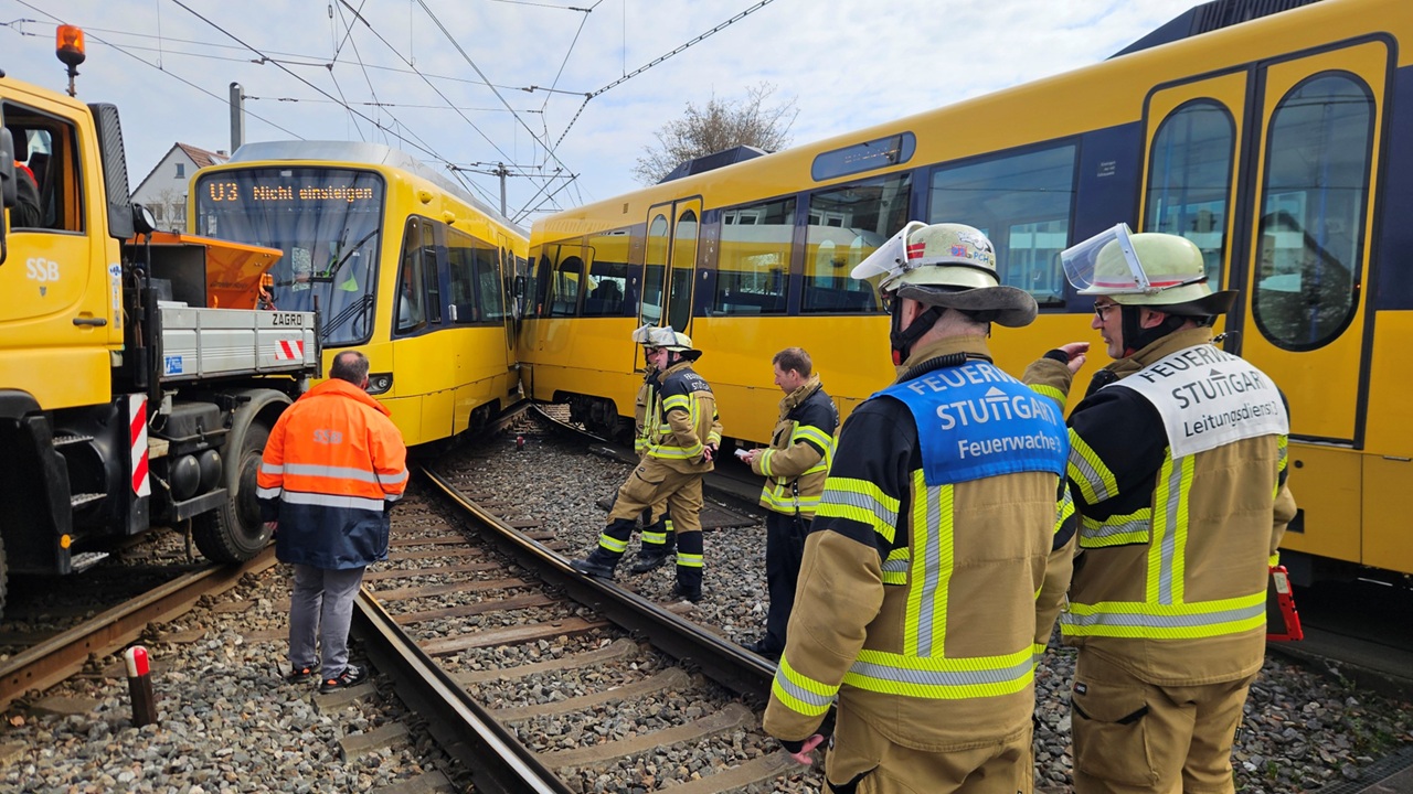 Glück gehabt haben Fahrer und Fahrgäste beim Zusammenstoß zweier Stadtbahnen in Stuttgart: Polizeiangaben zufolge wurde bei dem Vorfall niemand verletzt. Ersten Erkenntnissen zufolge hatte ein Stadtbahnfahrer am Vormittag abbiegen wollen und eine haltende Stadtbahn zu spät erkannt. Seine Bahn stieß seitlich gegen die andere. Während die eine Bahn auf Betriebsfahrt und unbesetzt war, befanden sich in der zweiten etwa 20 Fahrgäste. Die Unfallstelle wurde gesperrt.