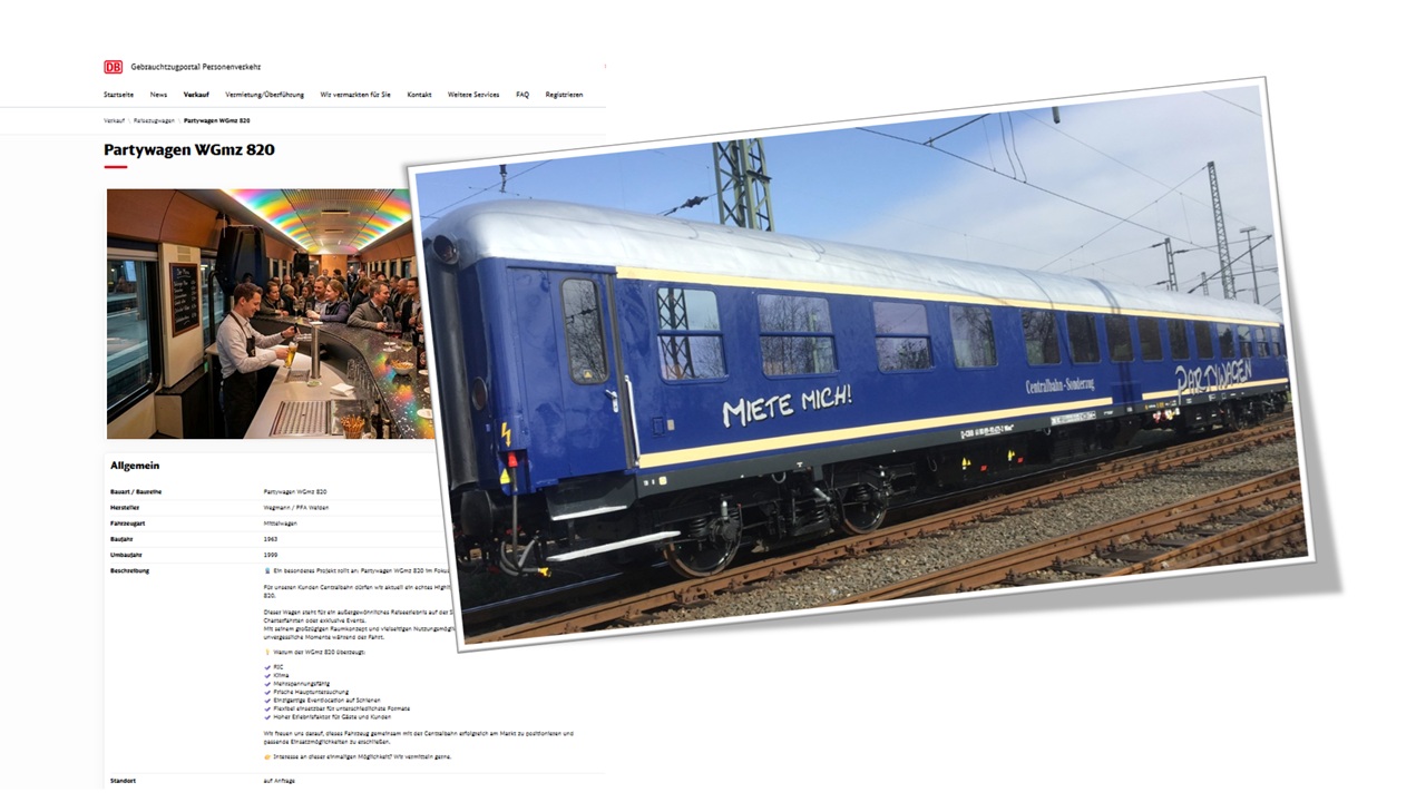 Ein besonderer Eisenbahnwagen wird derzeit über das Gebrauchtzugportal der Deutschen Bahn zum Verkauf angeboten. Dabei handelt es sich um einen Partywagen der Baureihe WGmz 820, der im Auftrag der Centralbahn vermarktet wird.