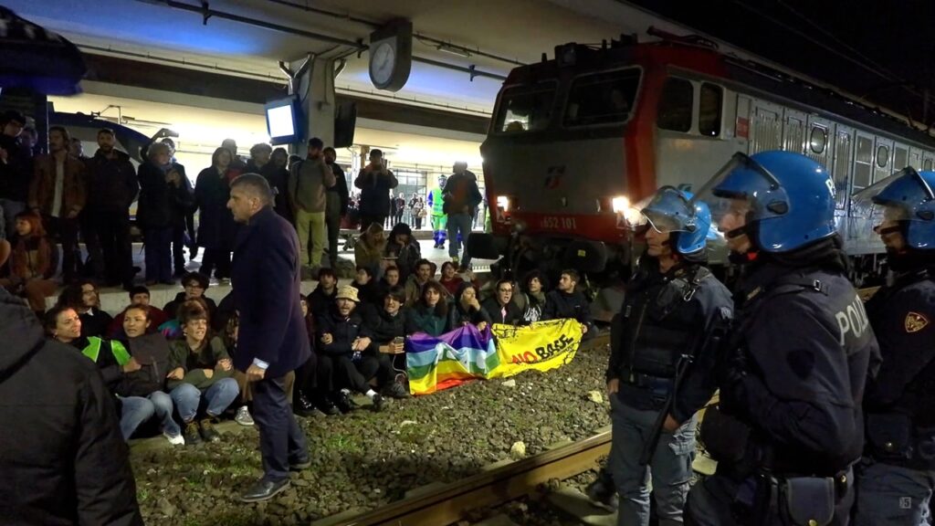 Demonstranten haben im Bahnhof Pisa einen Güterzug blockiert, der Militärfahrzeuge geladen hatte. Die Aktivisten setzten und stellten sich auf die…