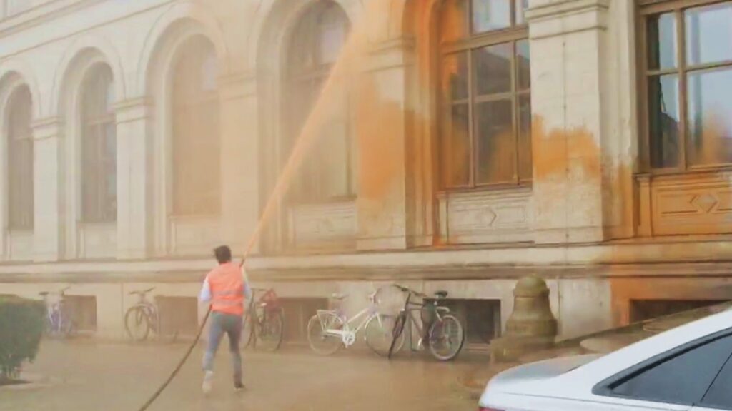 BERLIN | Klimaaktivisten der Letzten Generation haben am Dienstag das Bundesverkehrsministerium in Berlin mit Farb-Wasser besprüht.