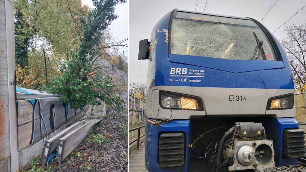 Ein Baum stürzt in München auf eine Bahnstrecke und drückt die Lärmschutzwand ein. Der Lokführer eines Regionalzuges mit etwa 400…