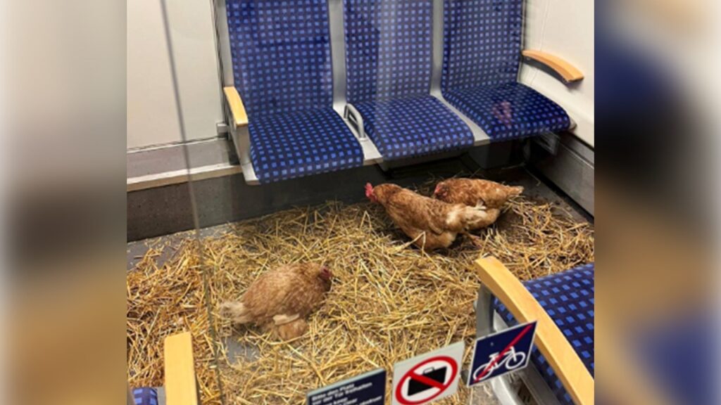 In der S6 von Essen nach Köln entdeckt der Lokführer in der 1. Klasse drei Hennen auf einer Strohschicht. Noch…