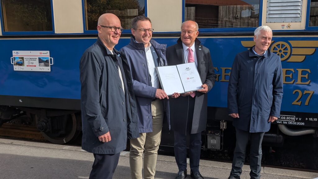Der Infrastrukturbetreiber der Deutschen Bahn kauft die Tegernsee-Bahn Betriebsgesellschaft mbH. Am Montagvormittag ist am Bahnhof Tegernsee der Vertrag symbolisch unterzeichnet worden.